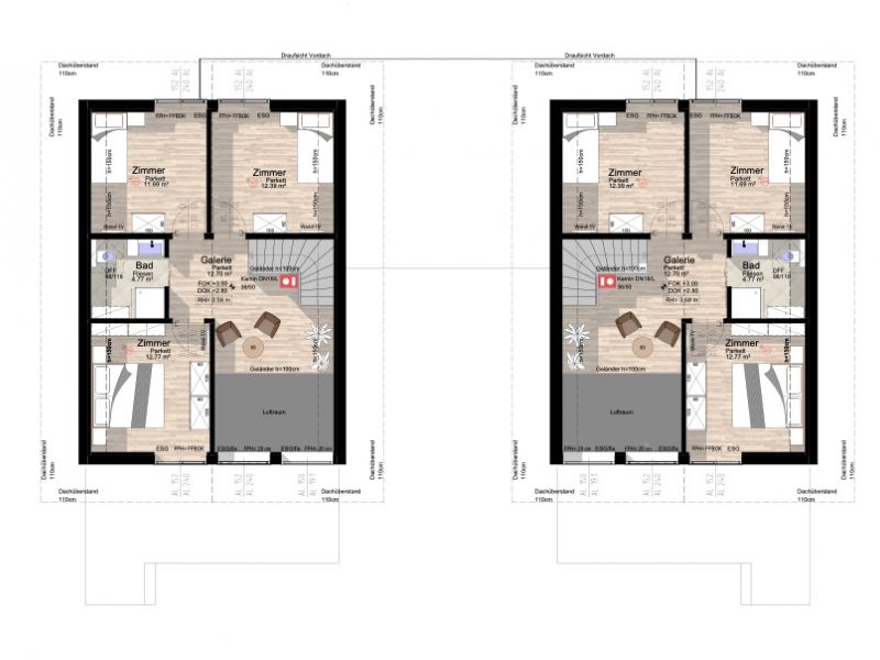 Entlüftung Bad Obergeschoss wird mittels Unterputzventilatoren über Dach entlüftet.