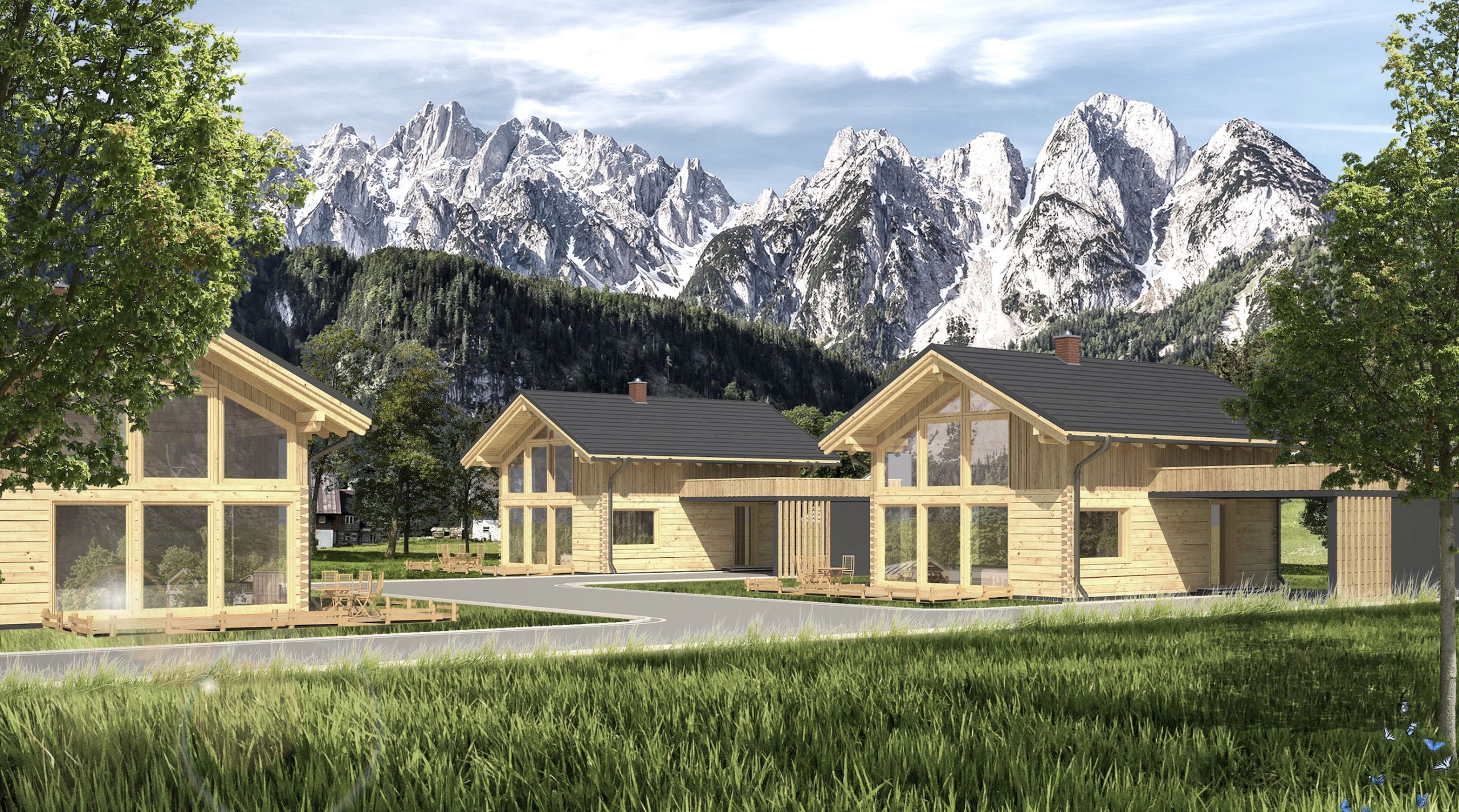 Fassade Lärchenschalung und teilweise Wärmedämmverbundsystem mit Putzflächen.